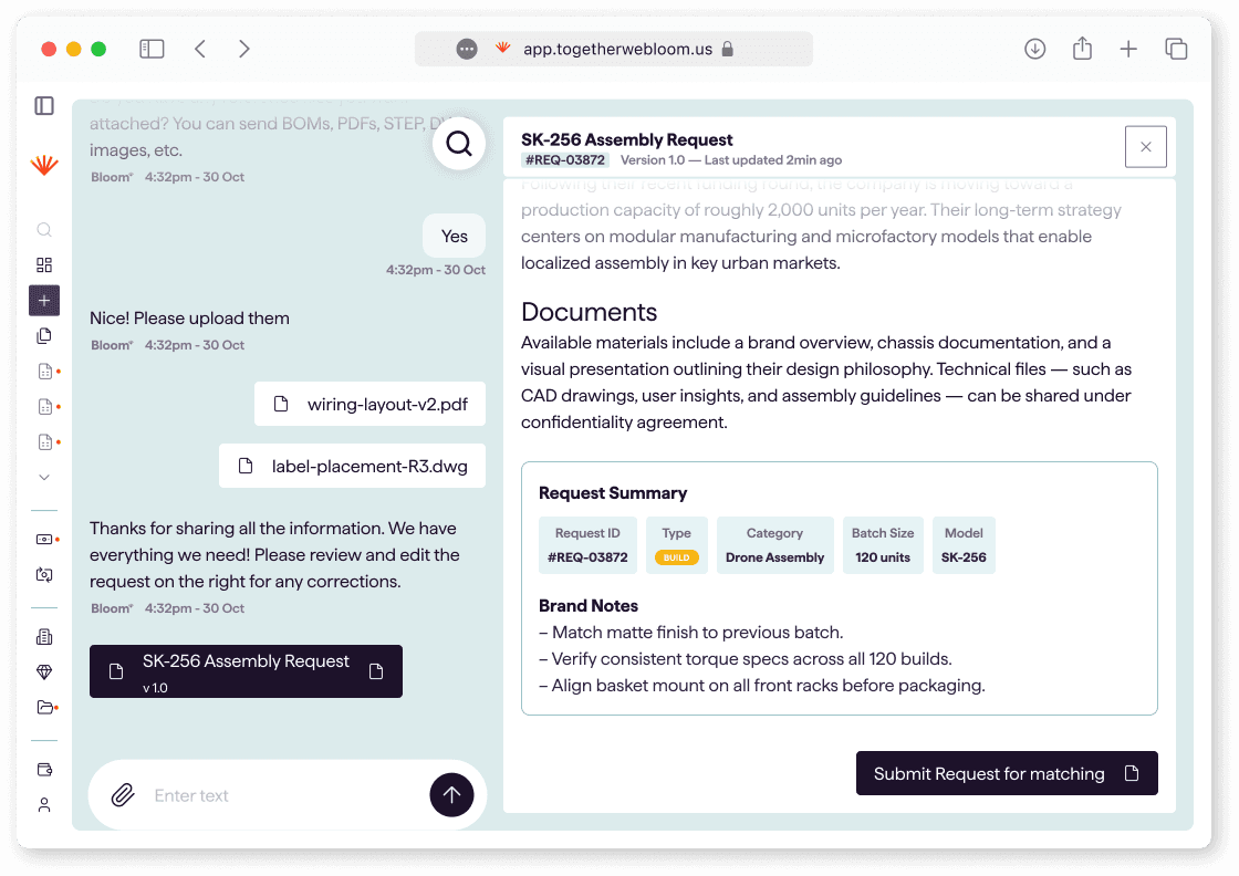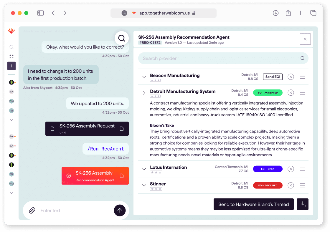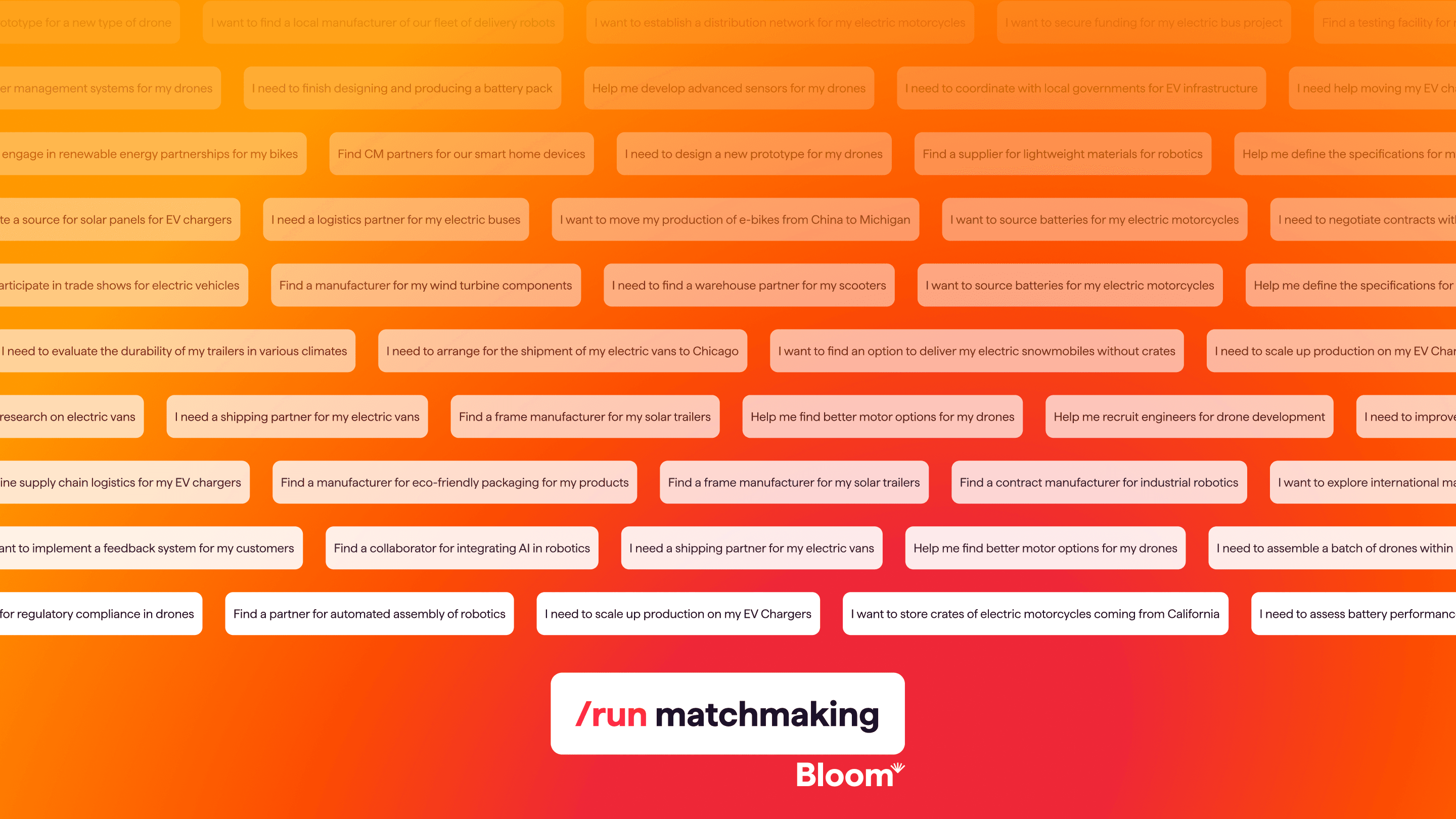 Bloom started as a hands-on network helping hardware teams find the right partners and get work done. After two years and 100+ brands, we’re encoding what works into an AI-native platform that understands your project, finds the right providers, and manages the trust, coordination, and payments in between.